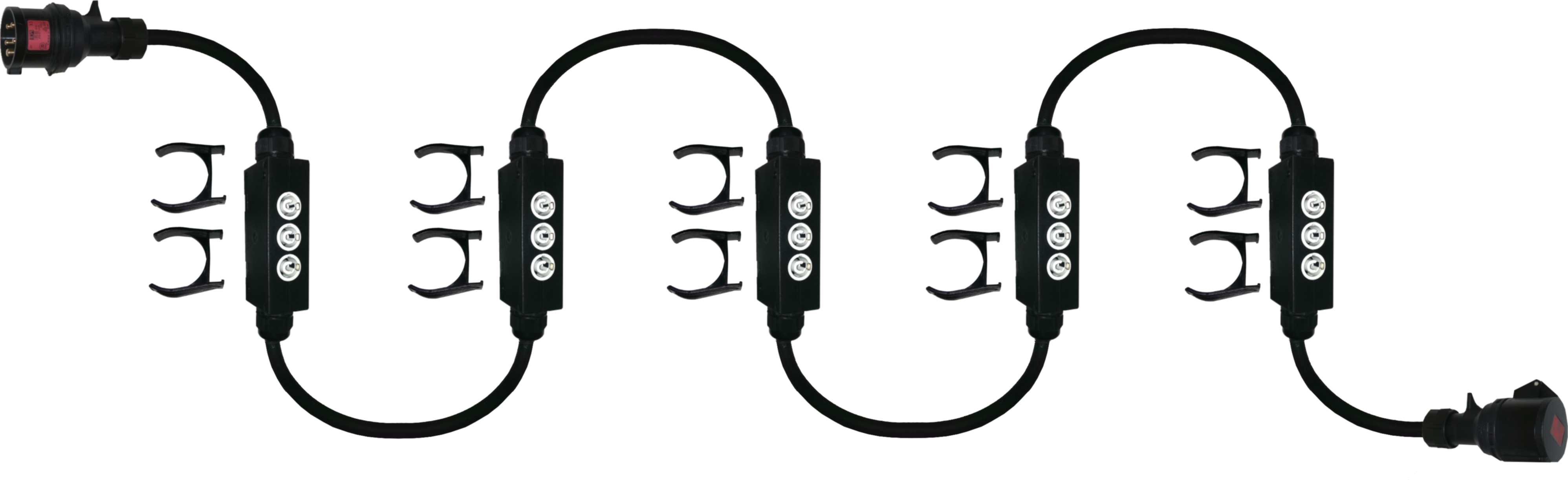 Start und Ende ist jedoch ein fest verdrahteter CEE16 Kabelstecker/bzw. -Buchse