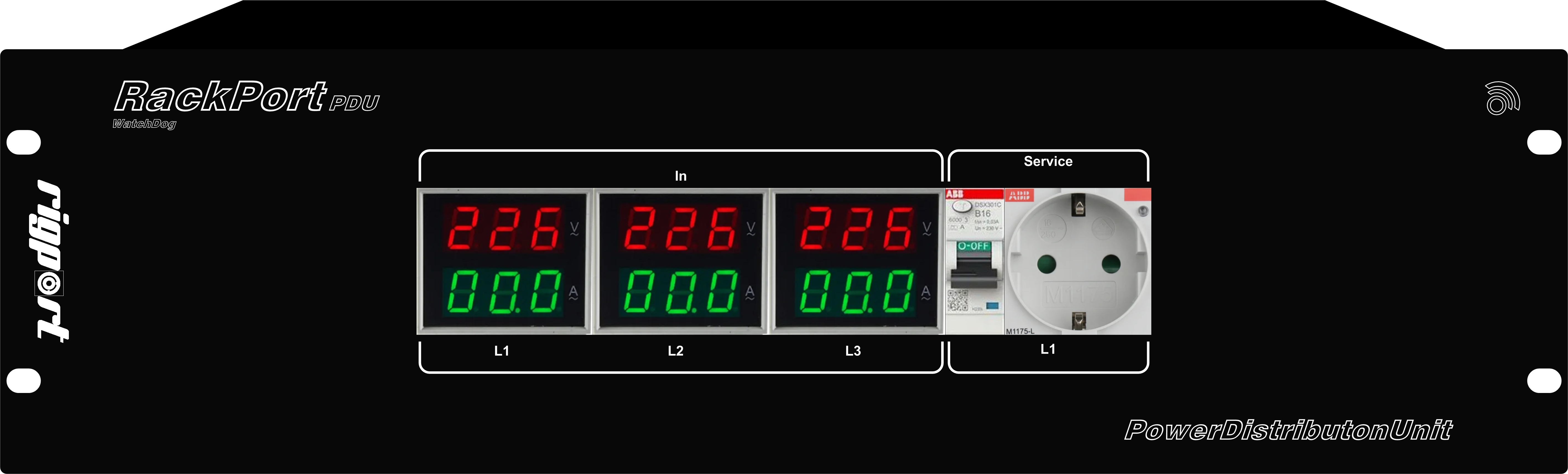 Der RackPortPM125-PM-WD ist ein 19" 3HE intelligenter smarter Powermonitor zum Einklinken in 3 phasige 125 Ampere Versorgungsstränge bestehender Verteiler-Racks.