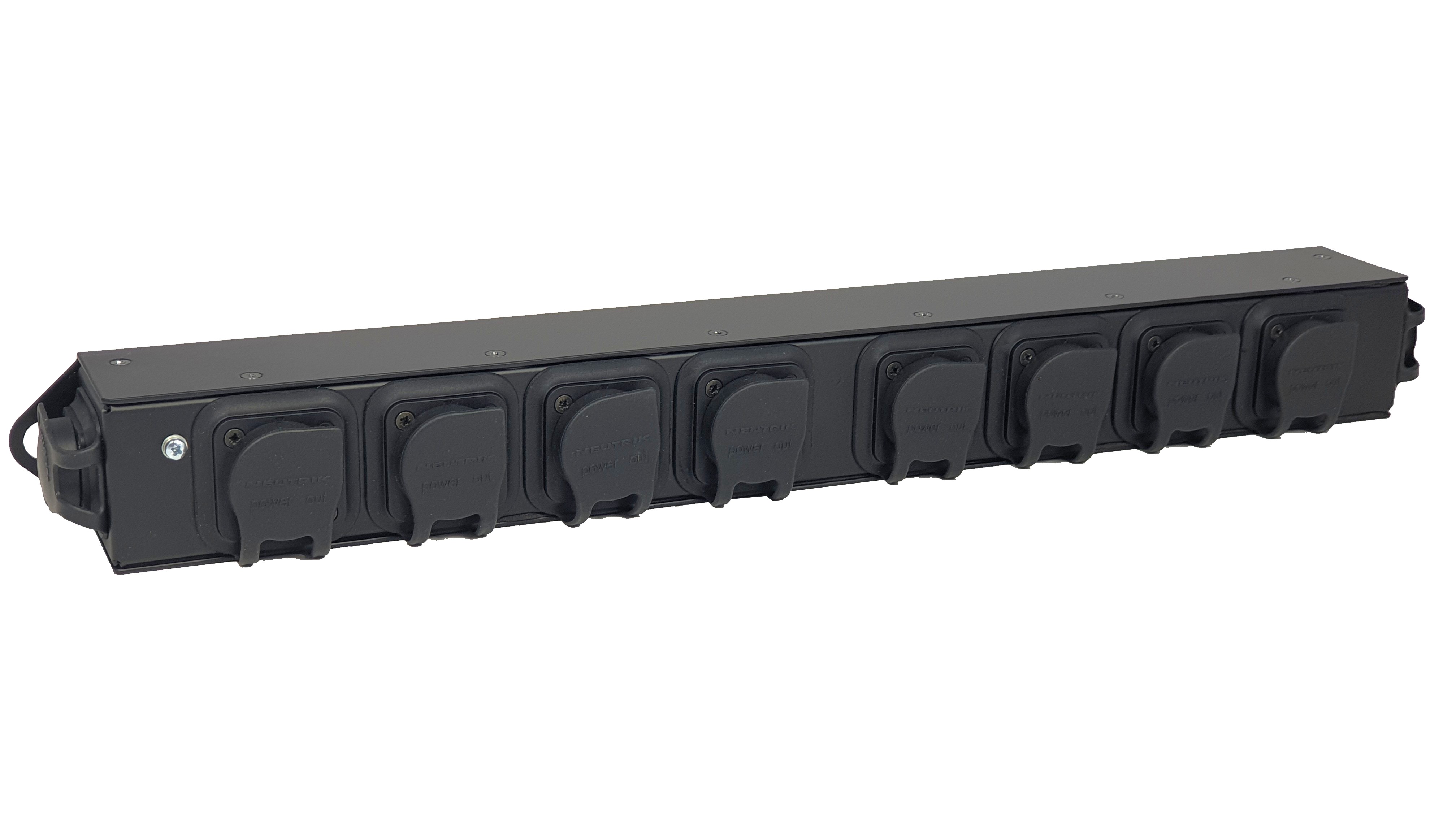 The RigPort8xT1 is an IP54, multiple connector with 8 Powercon True1 connections, suitable as a central star distribution for many devices in a nearby area.